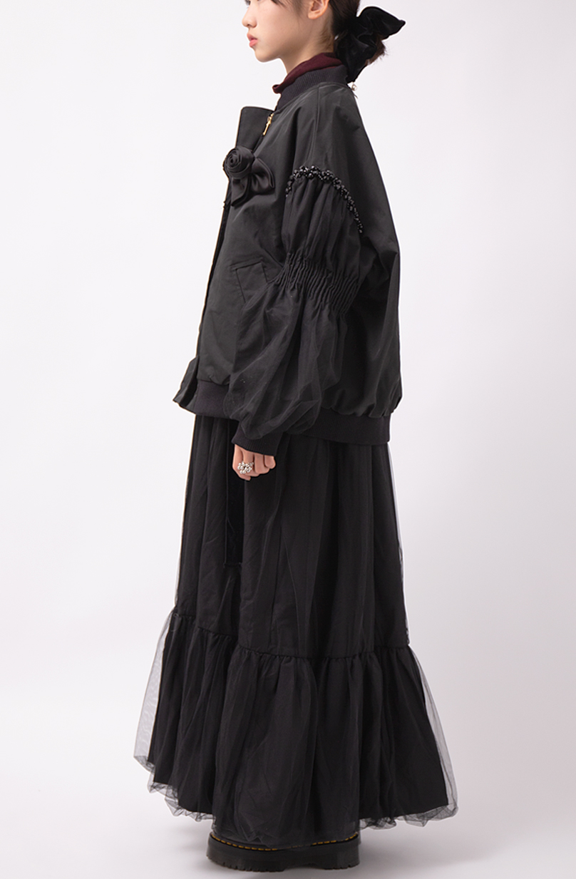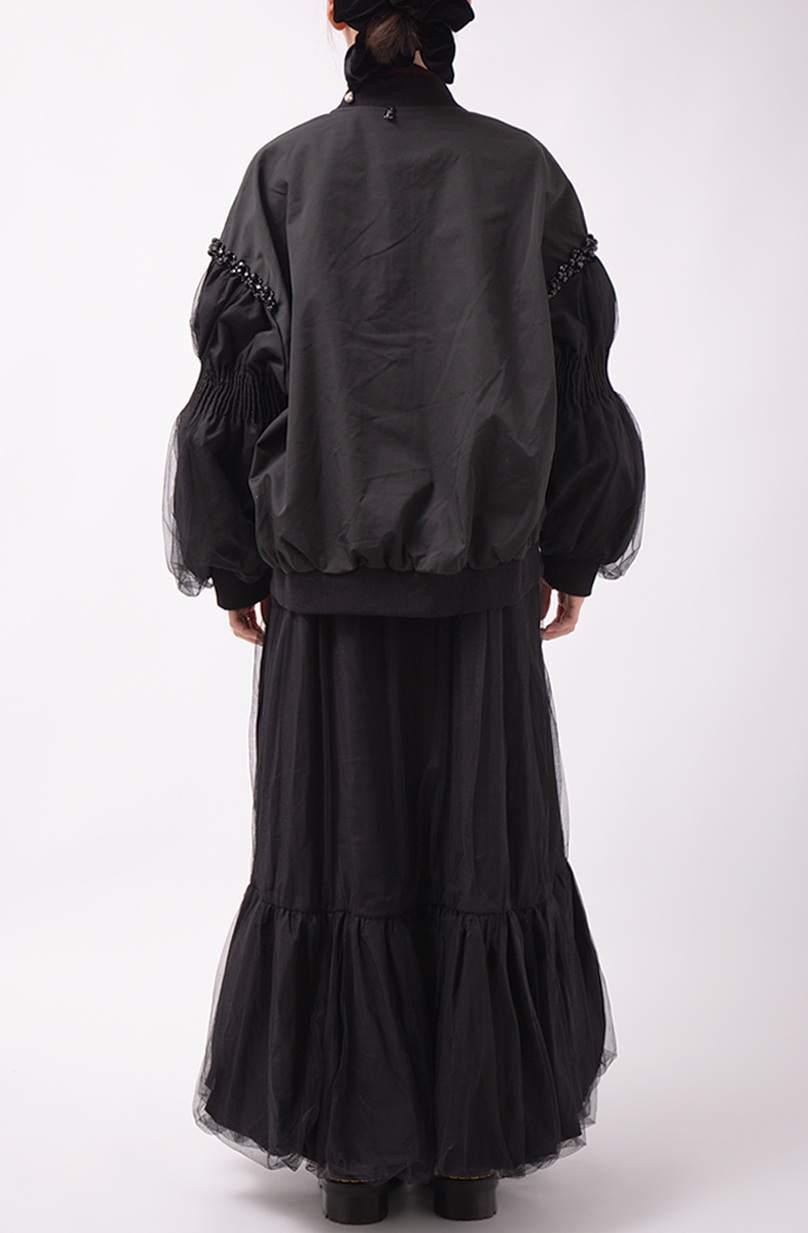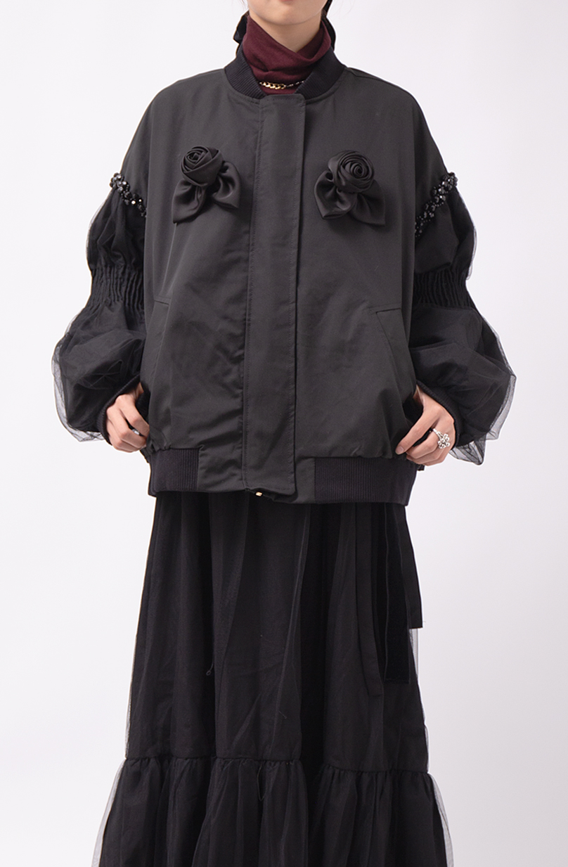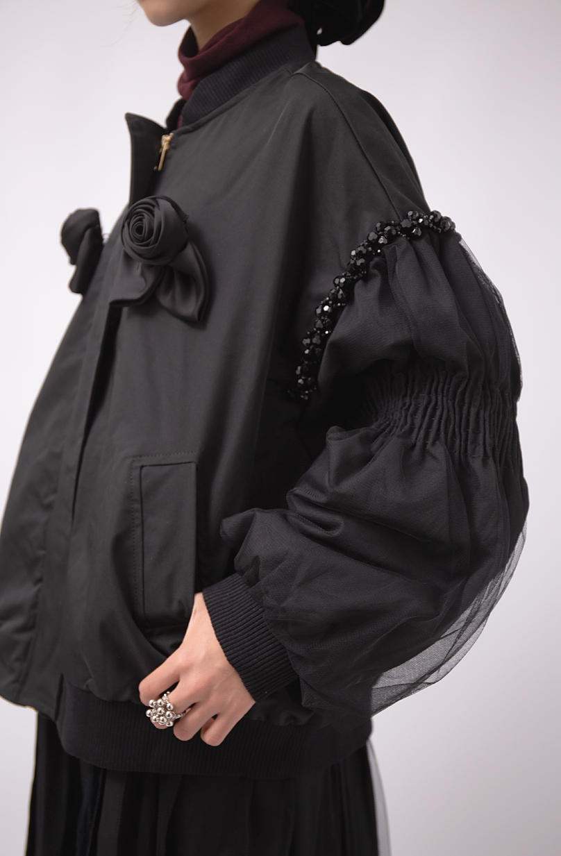 華やかさと軽やかさを両立した、チュール袖が目を惹くブルゾン。袖部分は二重仕立てのチュールで、動くたびふわりと空気を含み、女性らしい表情を生み出します。
