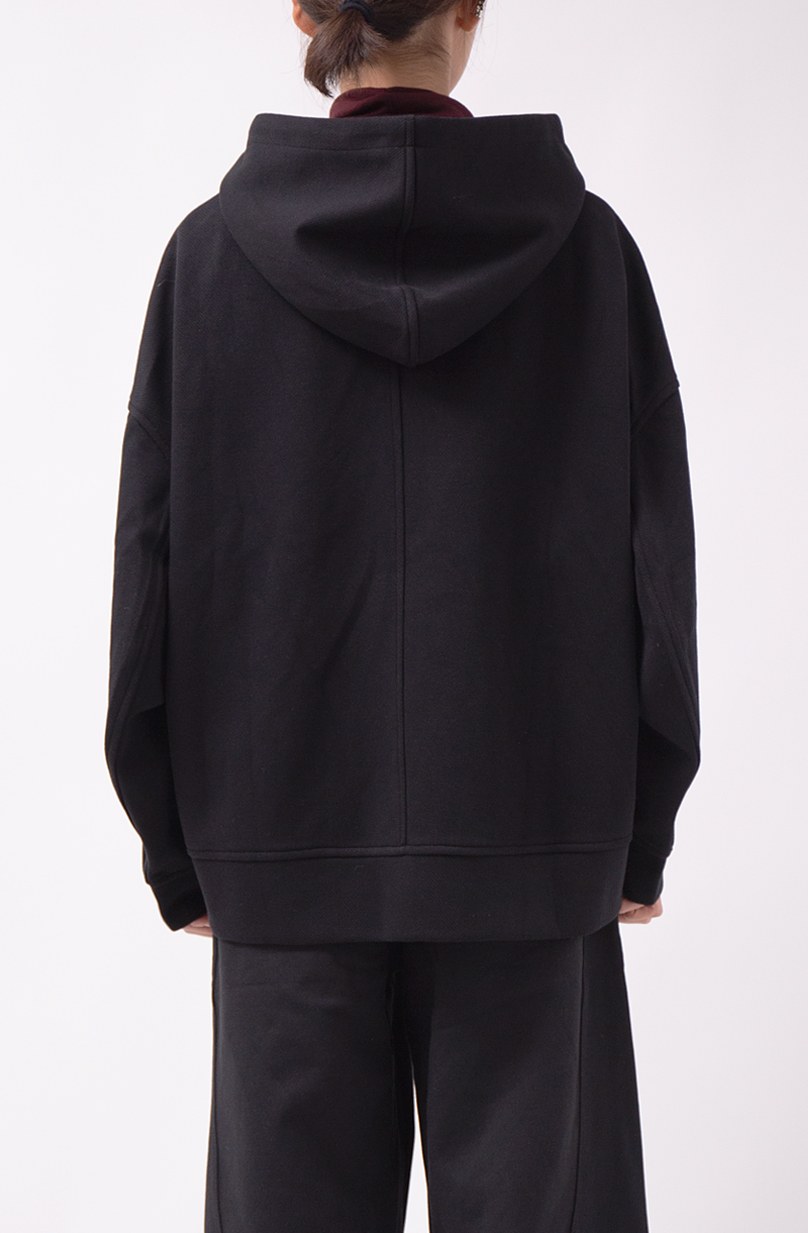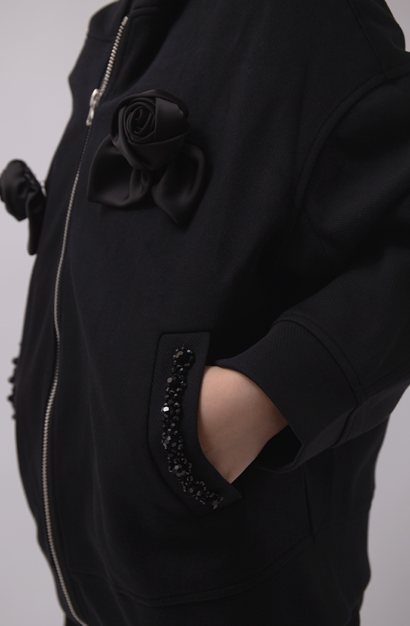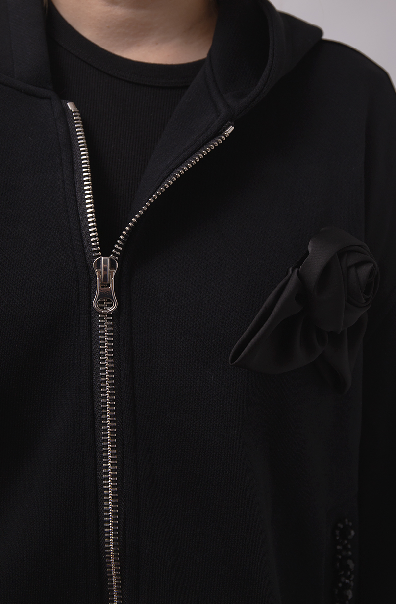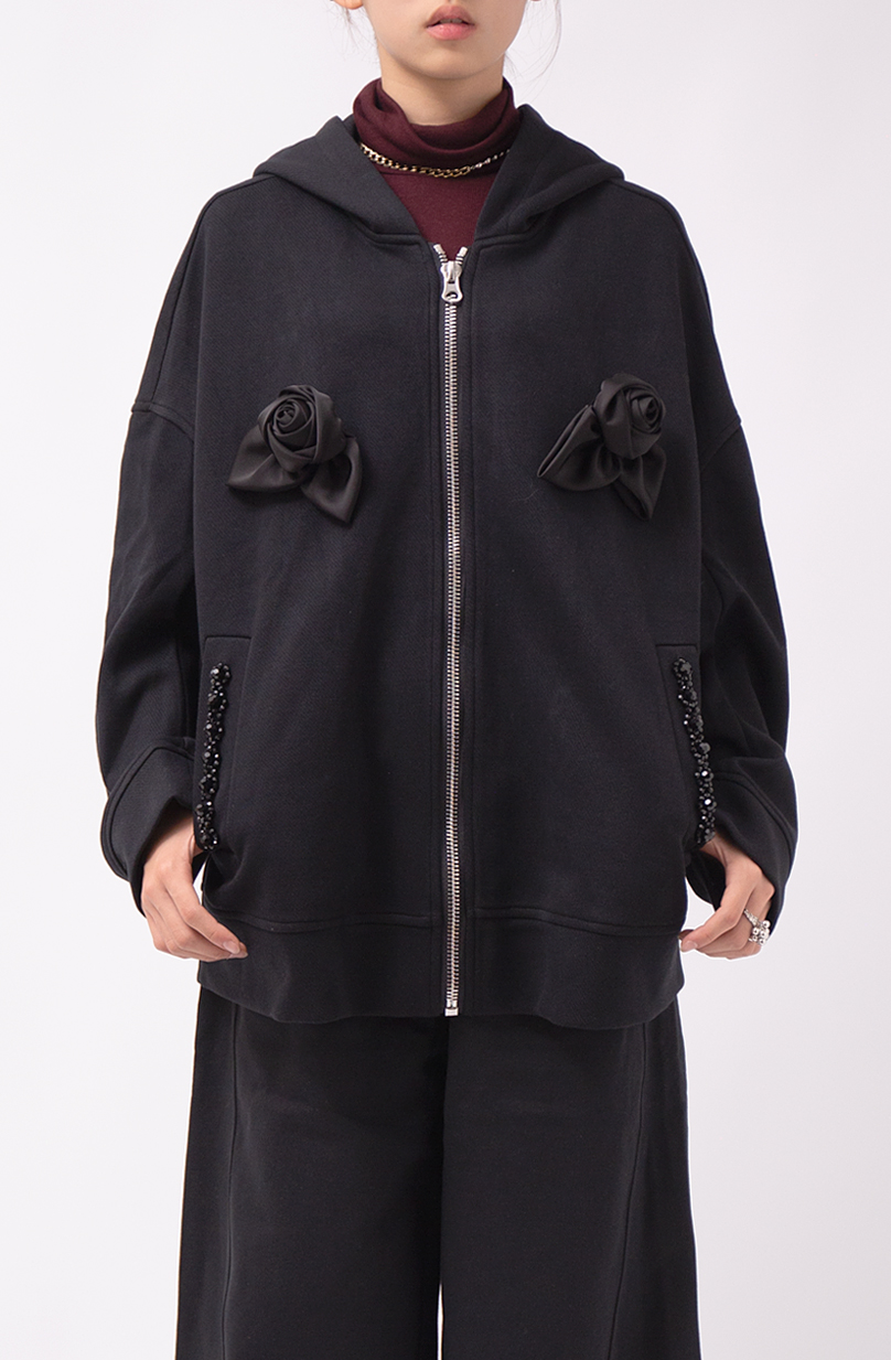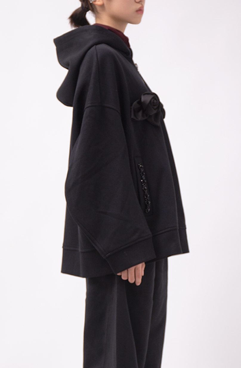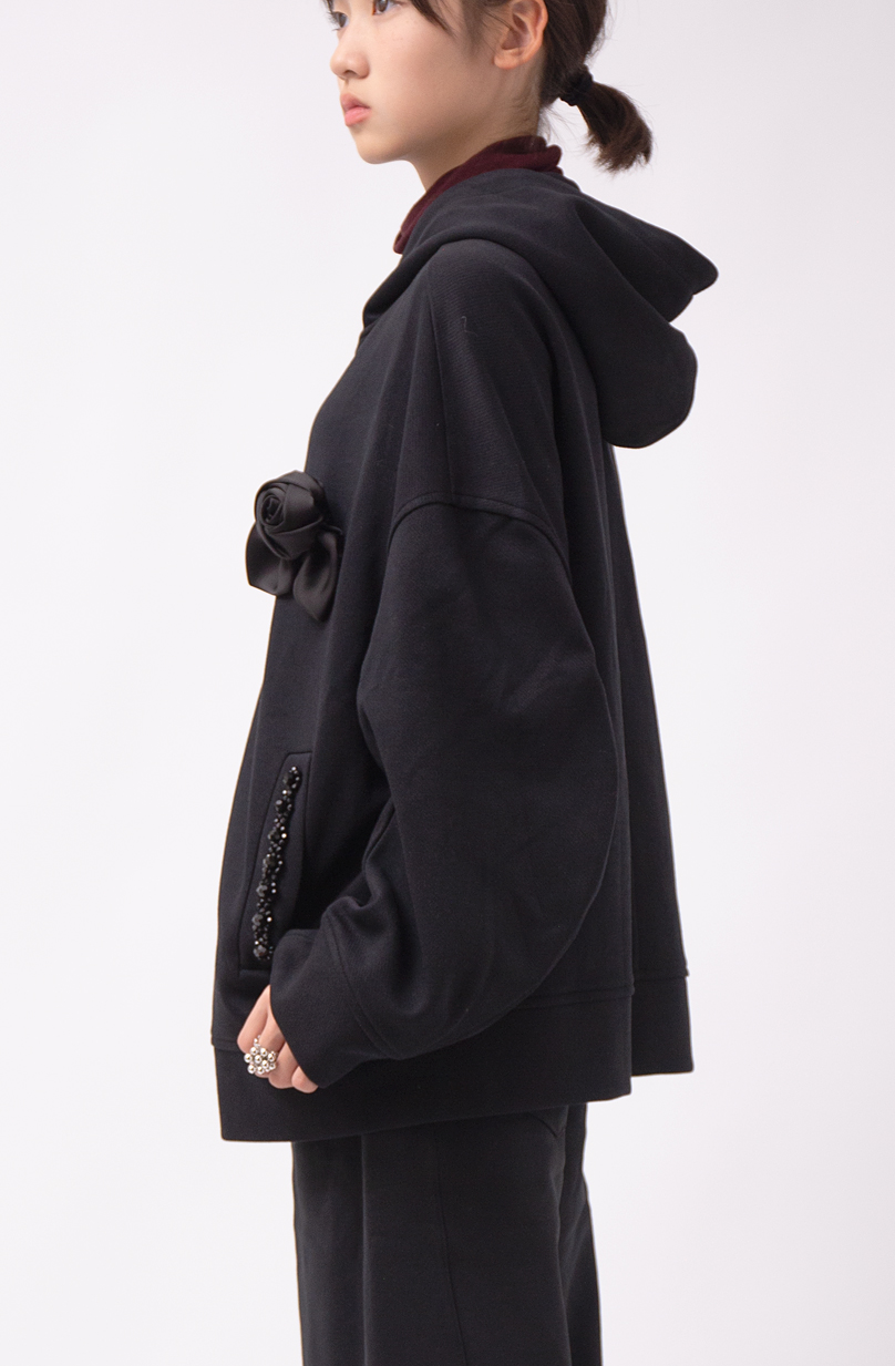 胸元のバラブローチがアクセントとなり、シンプルながらも存在感のあるデザインに。デイリーに着やすく、コーデの主役にもなる華やぎパーカーです。
