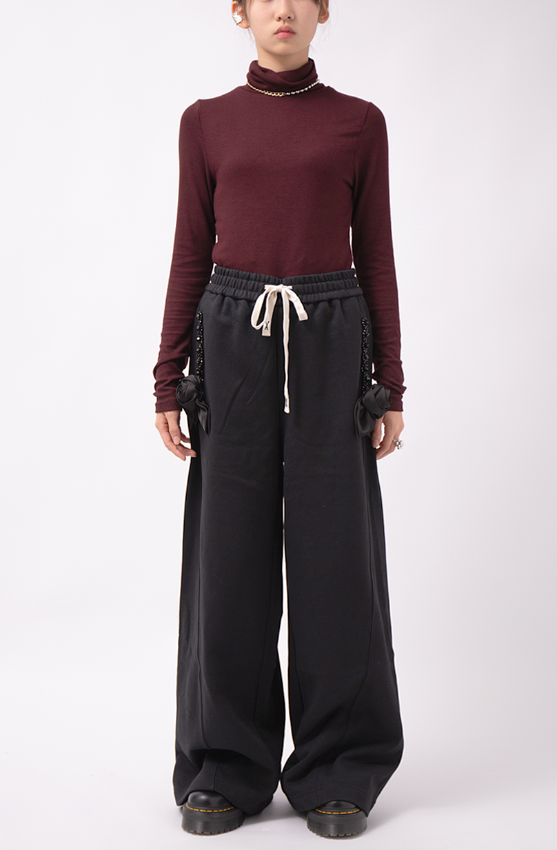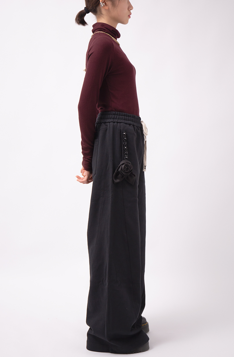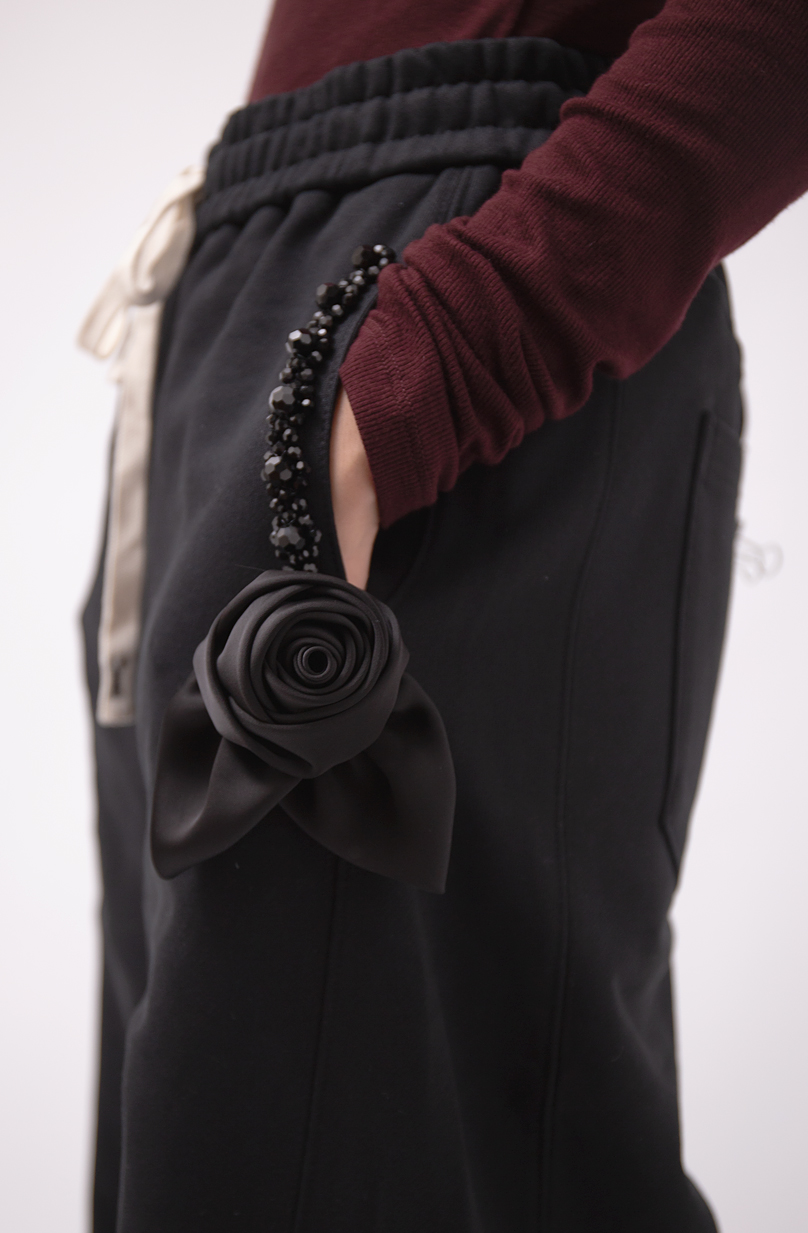 ポケットの横で光るストーンが、動くたびにきらり。バラブローチを添えれば、あなただけの特別なスタイルに。カジュアルにもキレイめにも変化する、頼れる一本です。