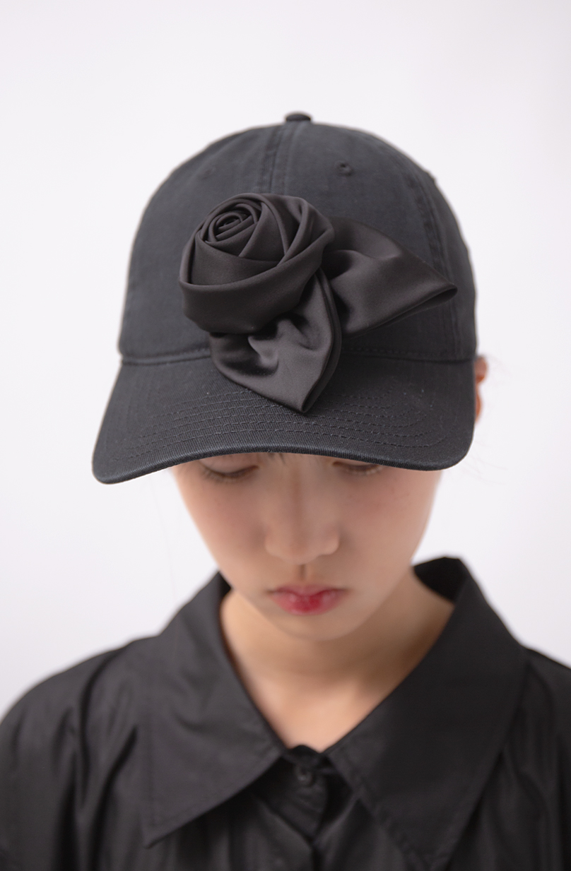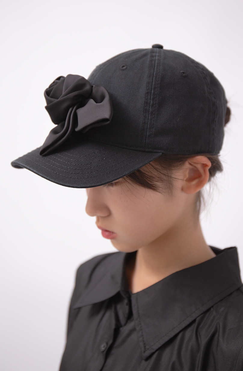 綿素材のカジュアルなキャップに、サテンのバラを縫い付けたデザイン。ほどよい艶感のバラがアクセントとなり、カジュアルすぎず大人っぽい雰囲気に仕上げています。