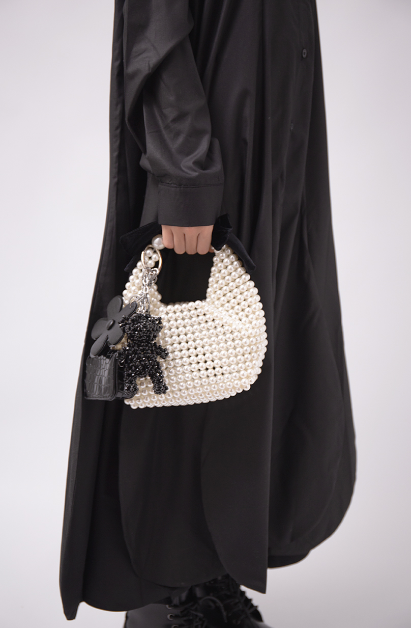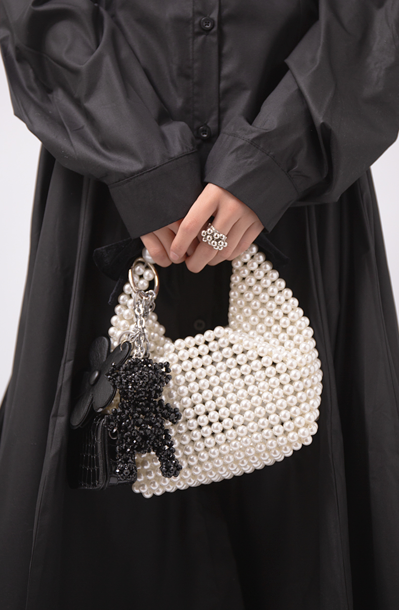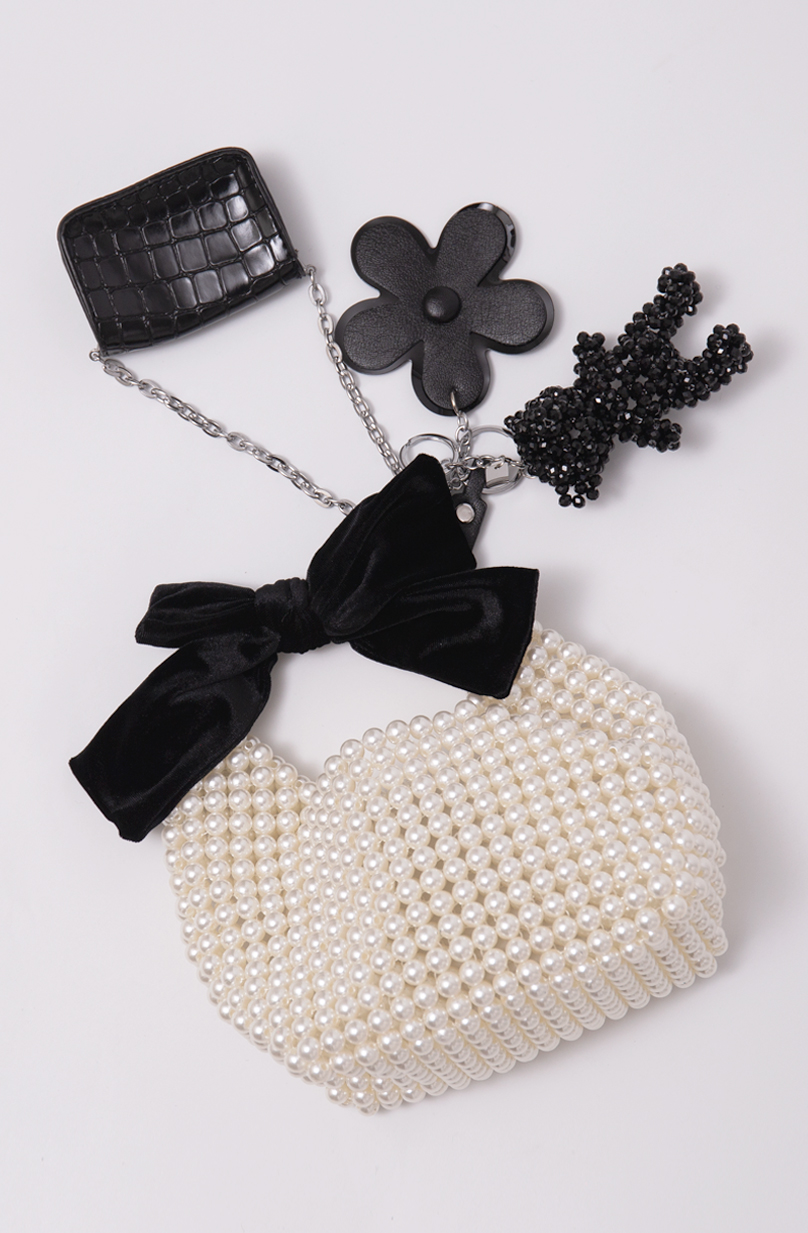 パールを一粒ずつ編んで形を形成したハンドバッグ。しっかりとした作りで少し重さはありますが、丸みのある小ぶりなサイズ感が可愛らしい印象です。イアホンやリップが収まる小ポーチ、花モチーフのチャーム、クリスタルビーズで編み上げたスタンディングベアのチャームをセットにしました。